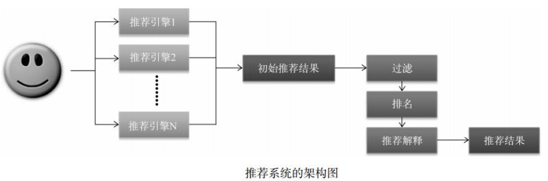 如果要在一个系统中把上面提到的各种特征和任务都统筹考虑,那么系统将会非常复杂,而且很难通过配置文件方便地配置不同特征和任务的权重。因此,推荐系统需要由多个推荐引擎组成,每个推荐引擎负责一类特征和一种任务,而推荐系统的任务只是将推荐引擎的结果按照一定权重或者优先级合并、排序然后返回。